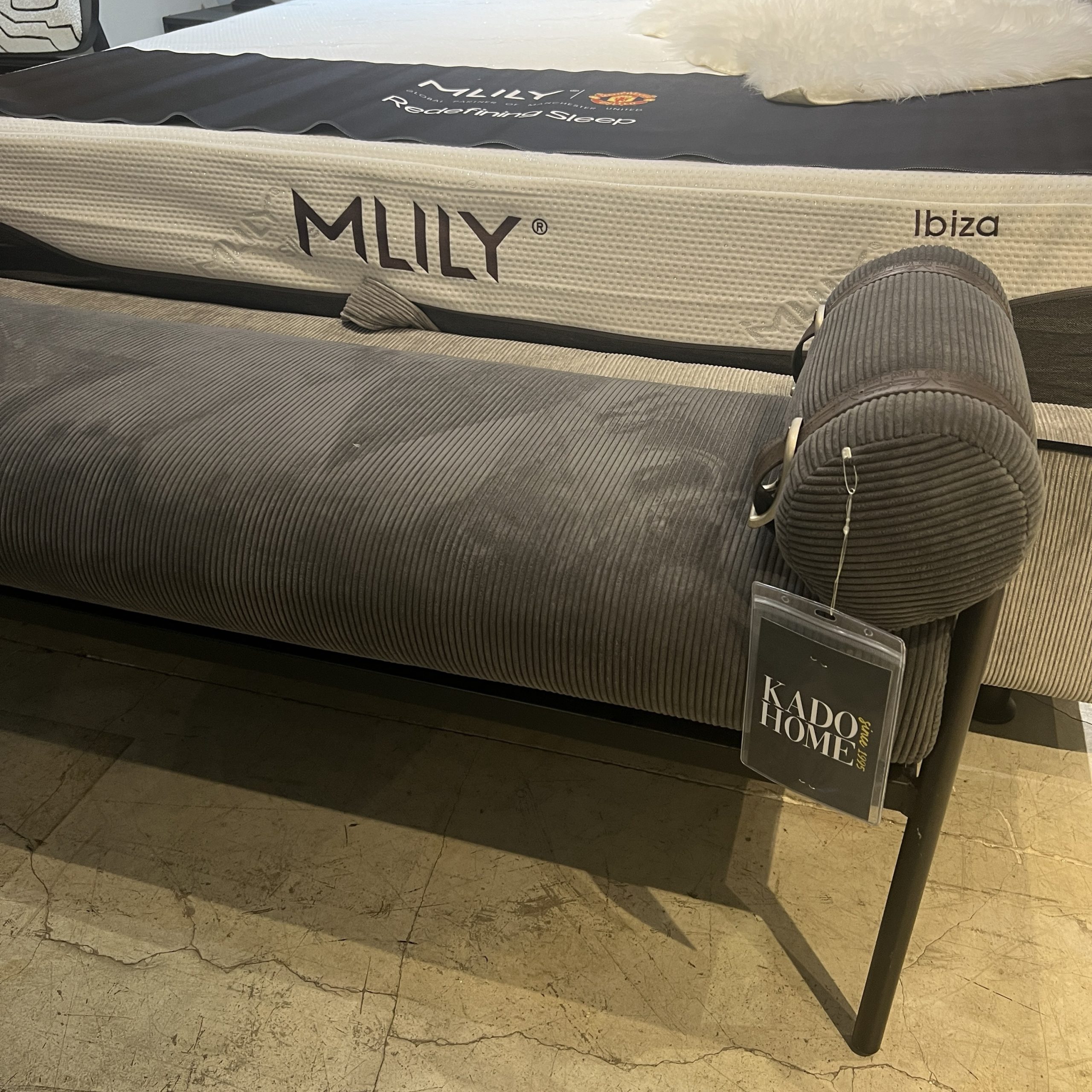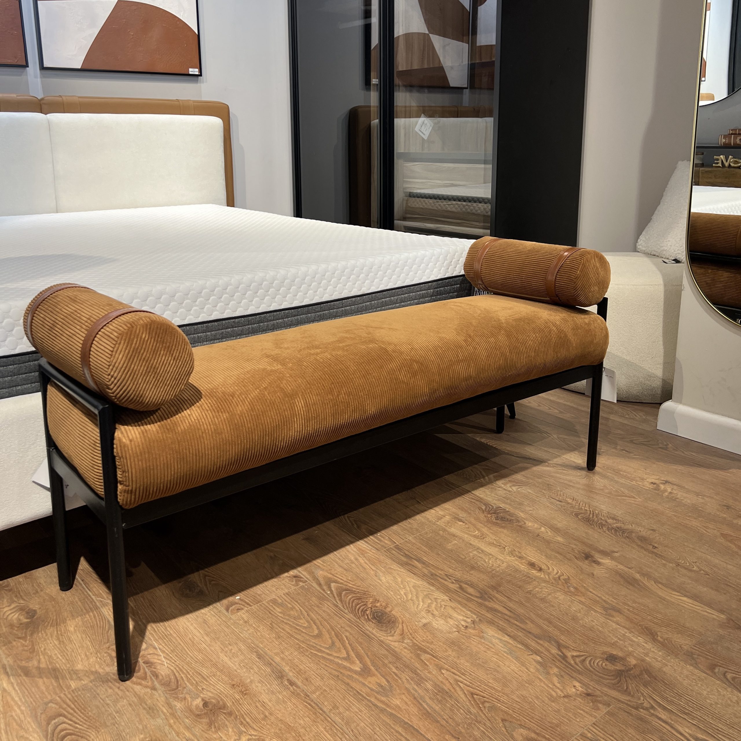 ספסל והדום ישיבה מלבני מודרני ואופנתי המרופד בבד קורדרוי ורגלי ברזל מינימליסטית.