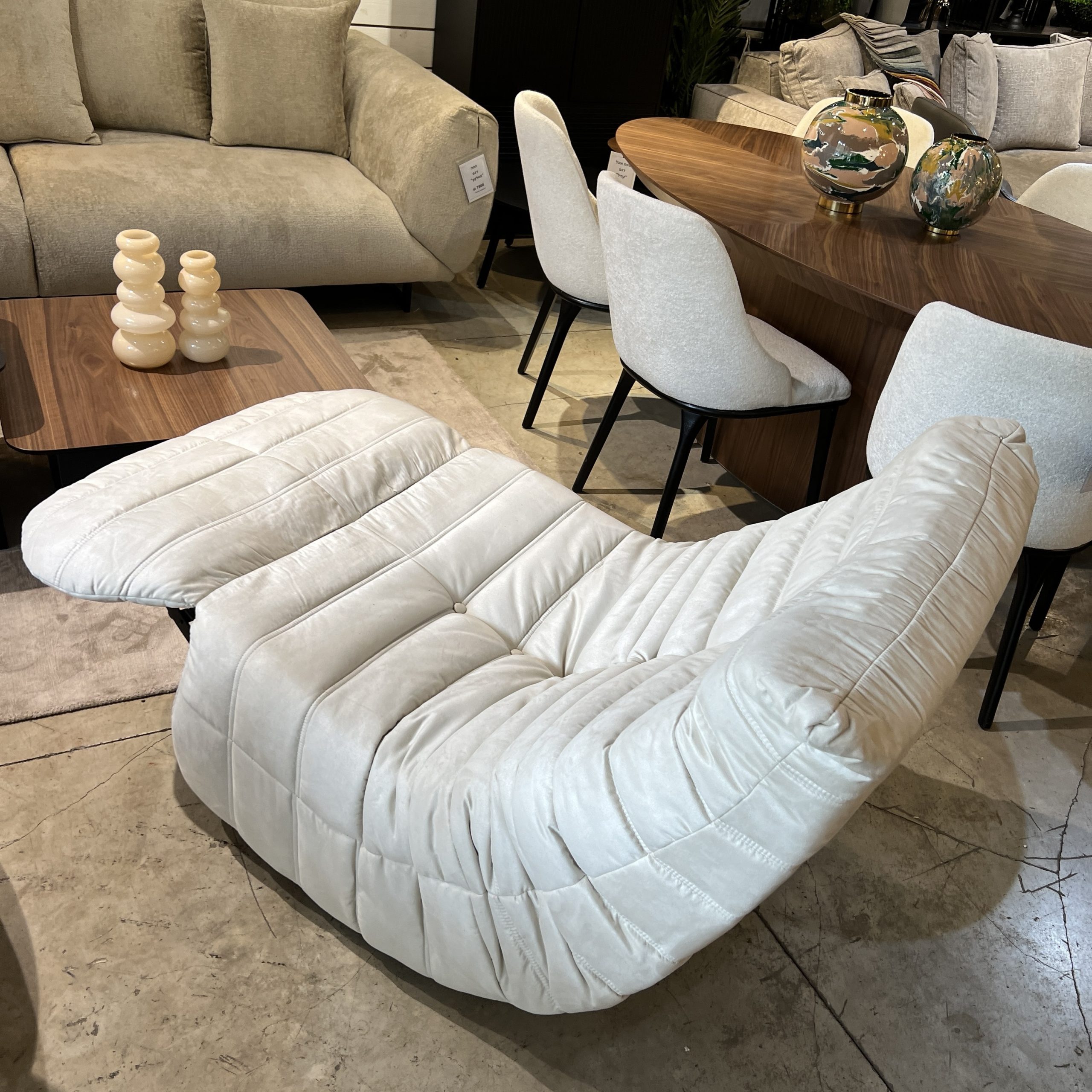 כורסא מסתובבת ונפתחת לרגליים דגם קימי בצבע בז, נוחה ומפנקת בעלת עיצוב חדשני, כורסאת אירוח מדוייקת לאיבזור חלל בקו טרנדי נקי.