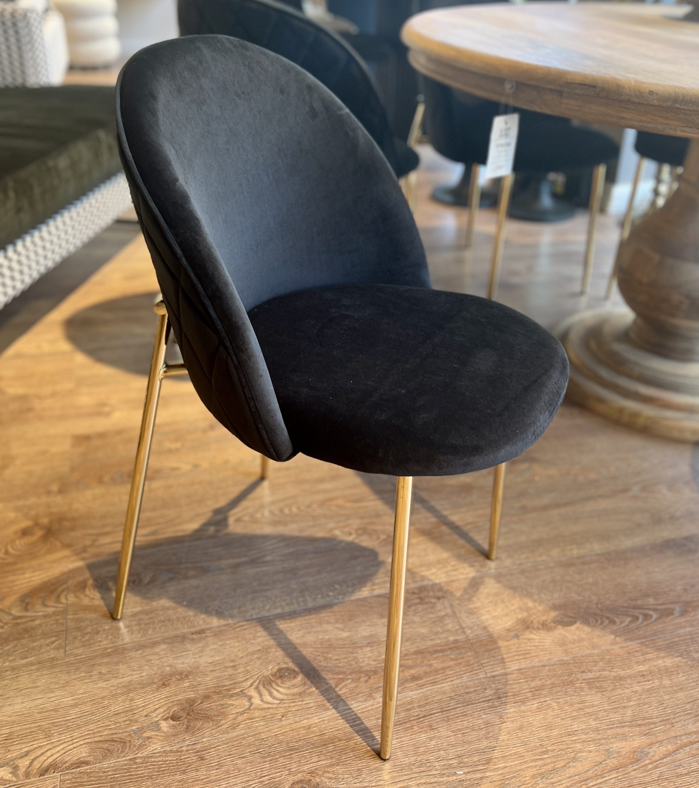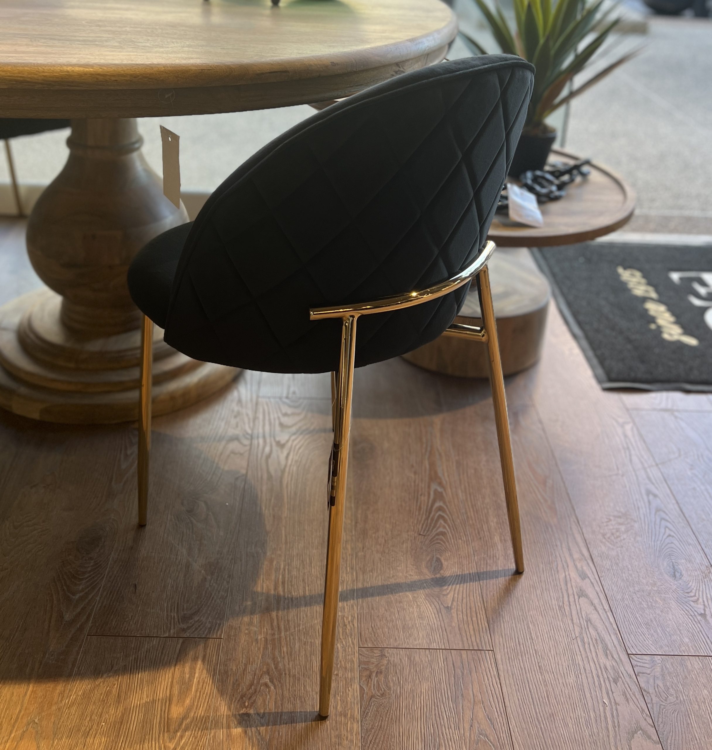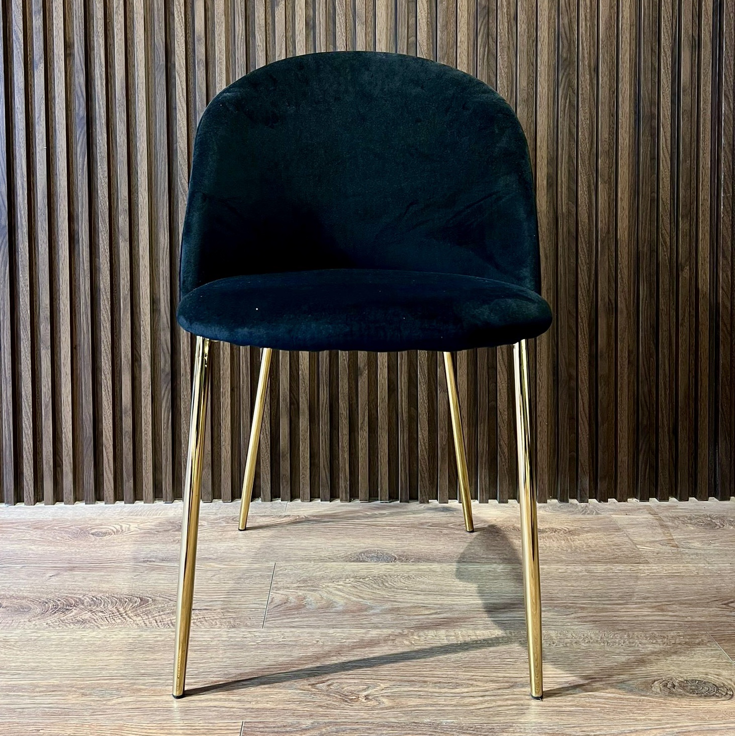 כיסא פינת אוכל יוקרתי בבד קטיפה שחור רחיץ ונעים למגע בשילוב תיפורים מעוינים מיוחדים בגב על רגל זהב ייחודית להשלמת המראה האלגנטי והמרשים.