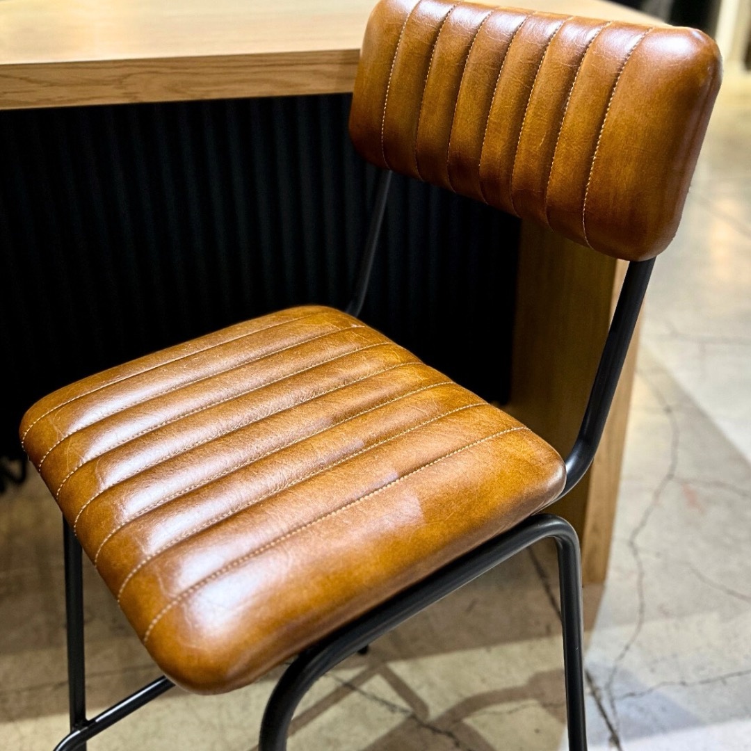 כסא בר עם משענת עור בופאלו יוקרתי ורגליים ברזל שחור בסגנון אורבאני דגם אוכף עם משענת