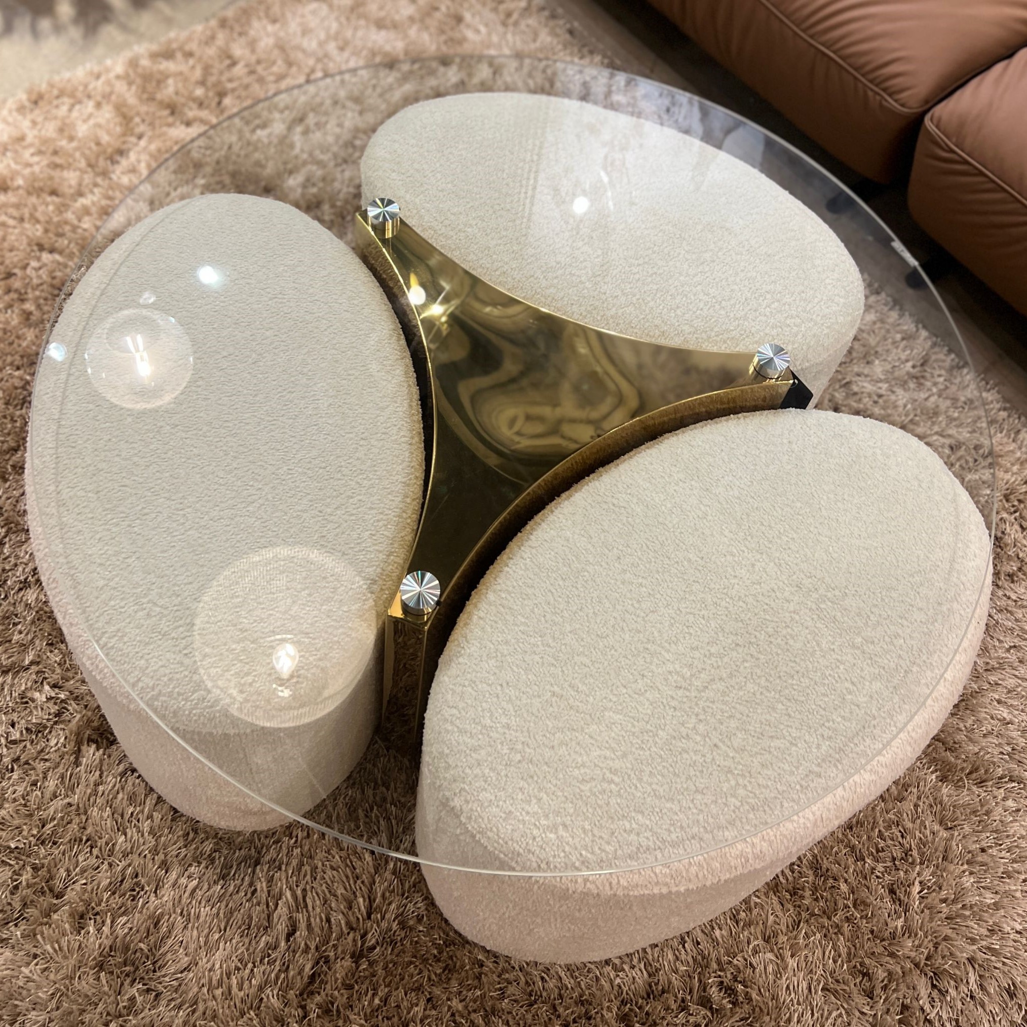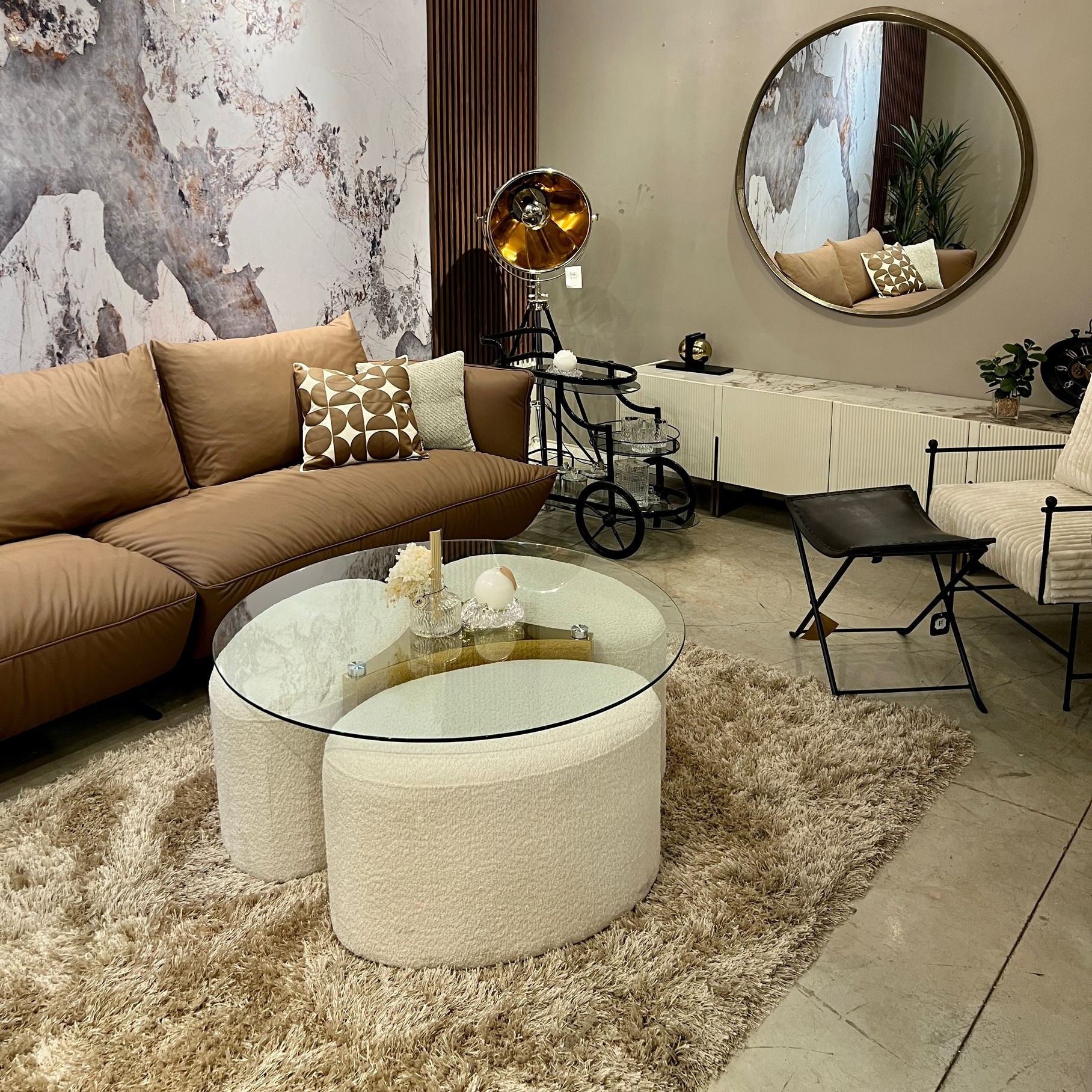 סט שולחן זכוכית יוקרתי עגול בשילוב 3 הדומים מרופדים פורצלן.