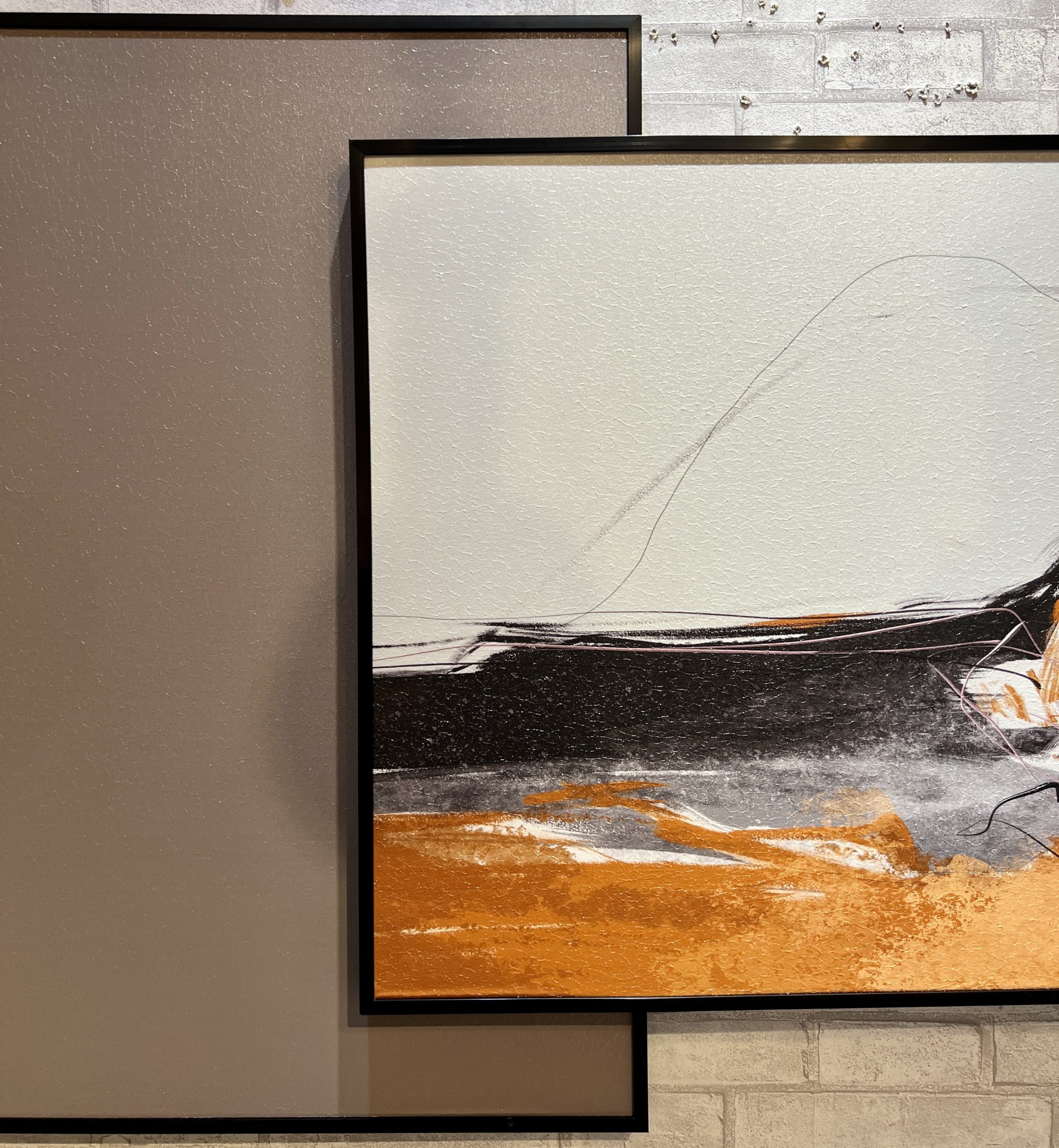 סט זוג תמונות ציור בעבודת יד על בסיס רקע לבן עם נגיעות צבעים עדינים שחור וכתום בעיצוב קלאסי ומרשים.