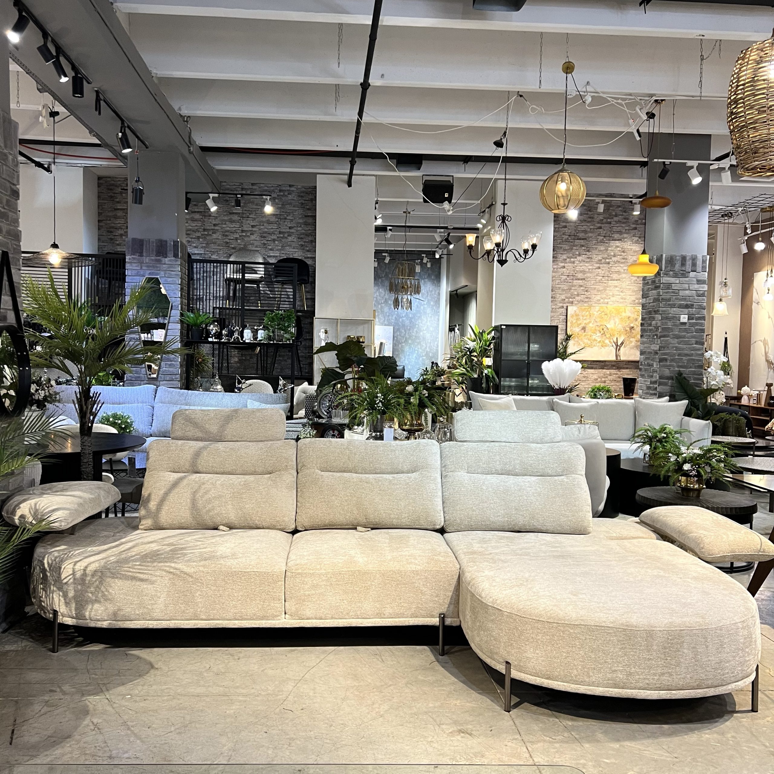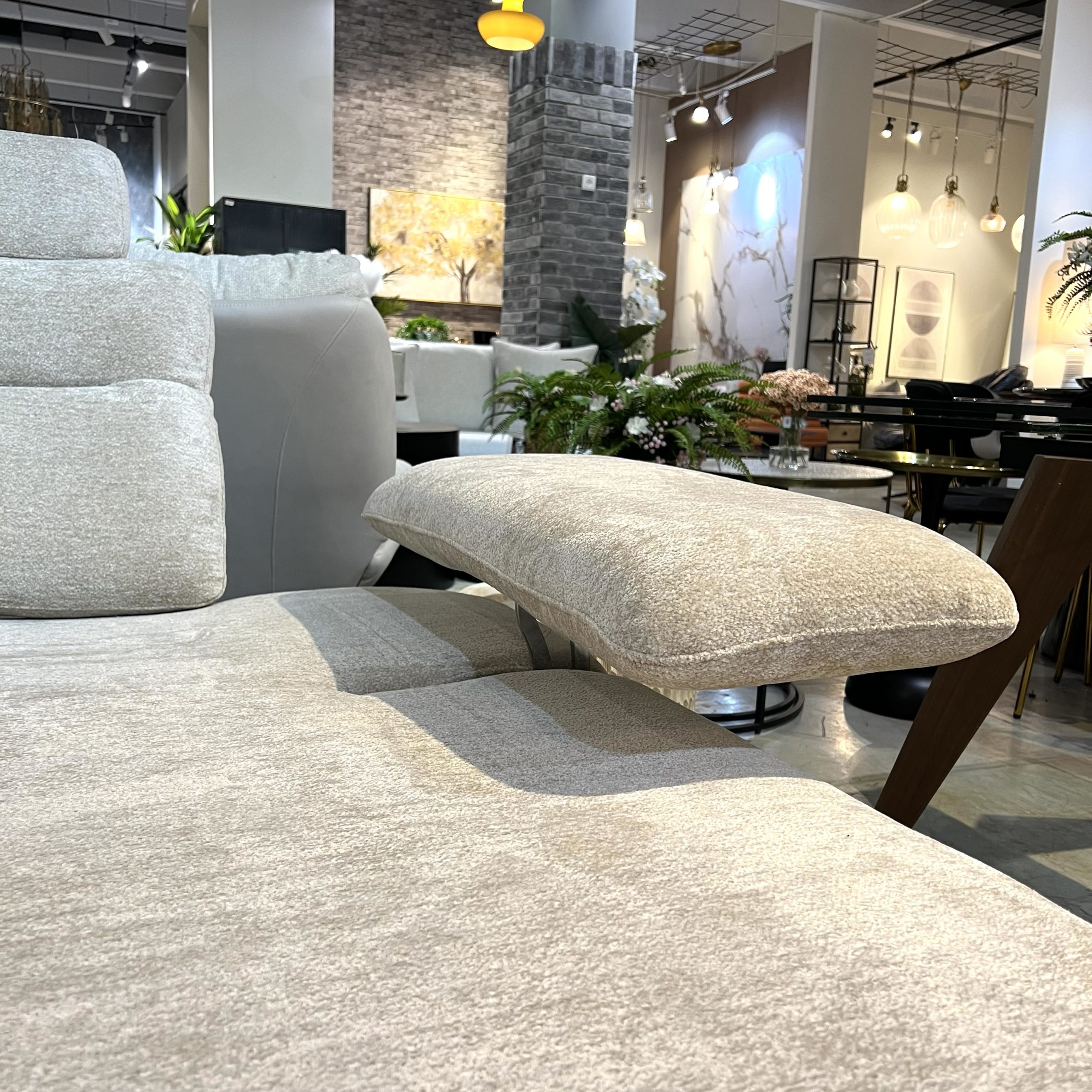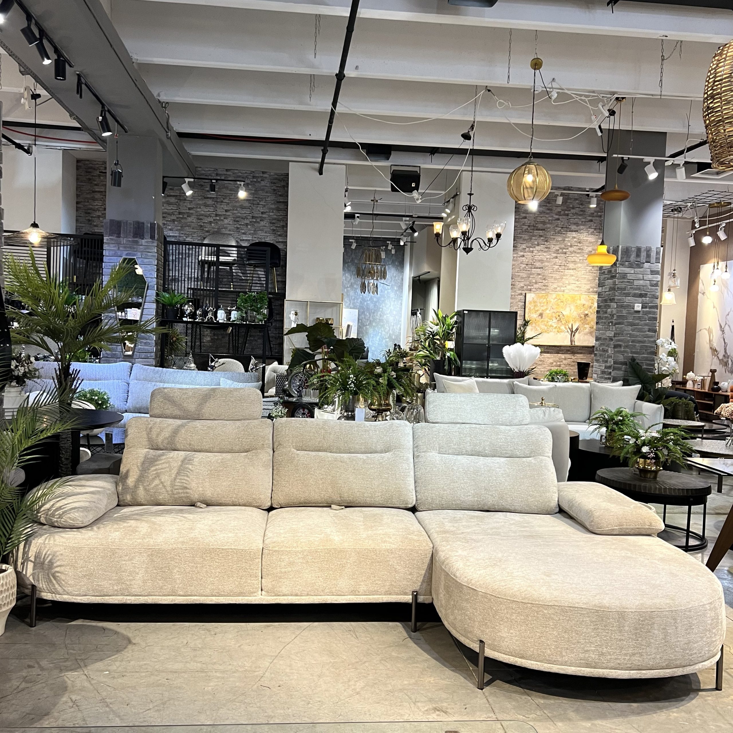 ספה פינתית דגם ביל בעיצוב חדשני ויוקרתי מרופדת בבד בז׳ המתנקה בקלות ורגלי מתכת מרשימות.