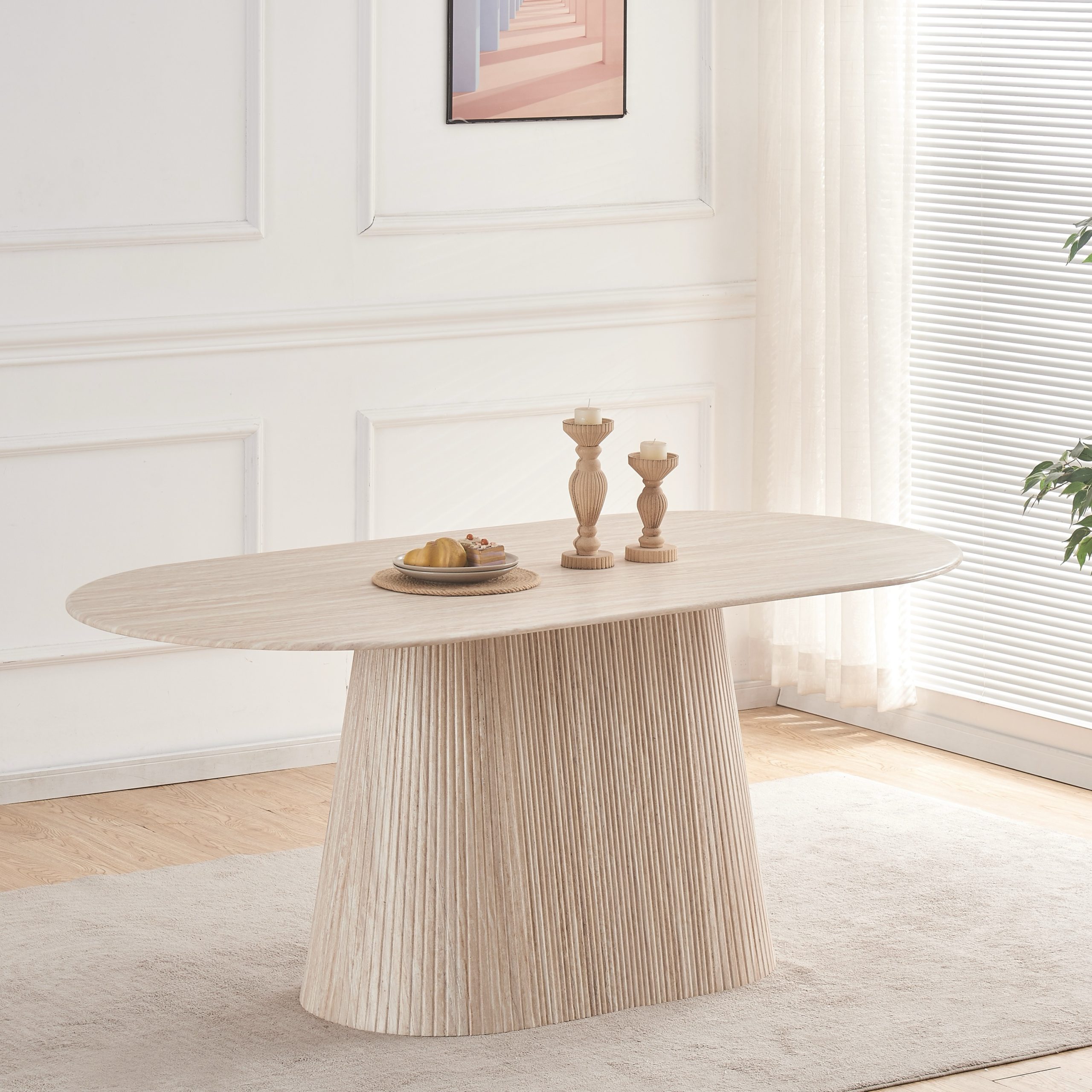 שולחן אוכל מלבני בעל פינות מעוגלות מעוצב בסטייל שיקפיץ וישדרג לכם את החלל בעיצוב נורדי מינימליסטי. שילוב מדהים של פלטת דמוי טרוונטין במראה טבעי להפליא, רגל עגולה בשילוב פסים לאורך.
