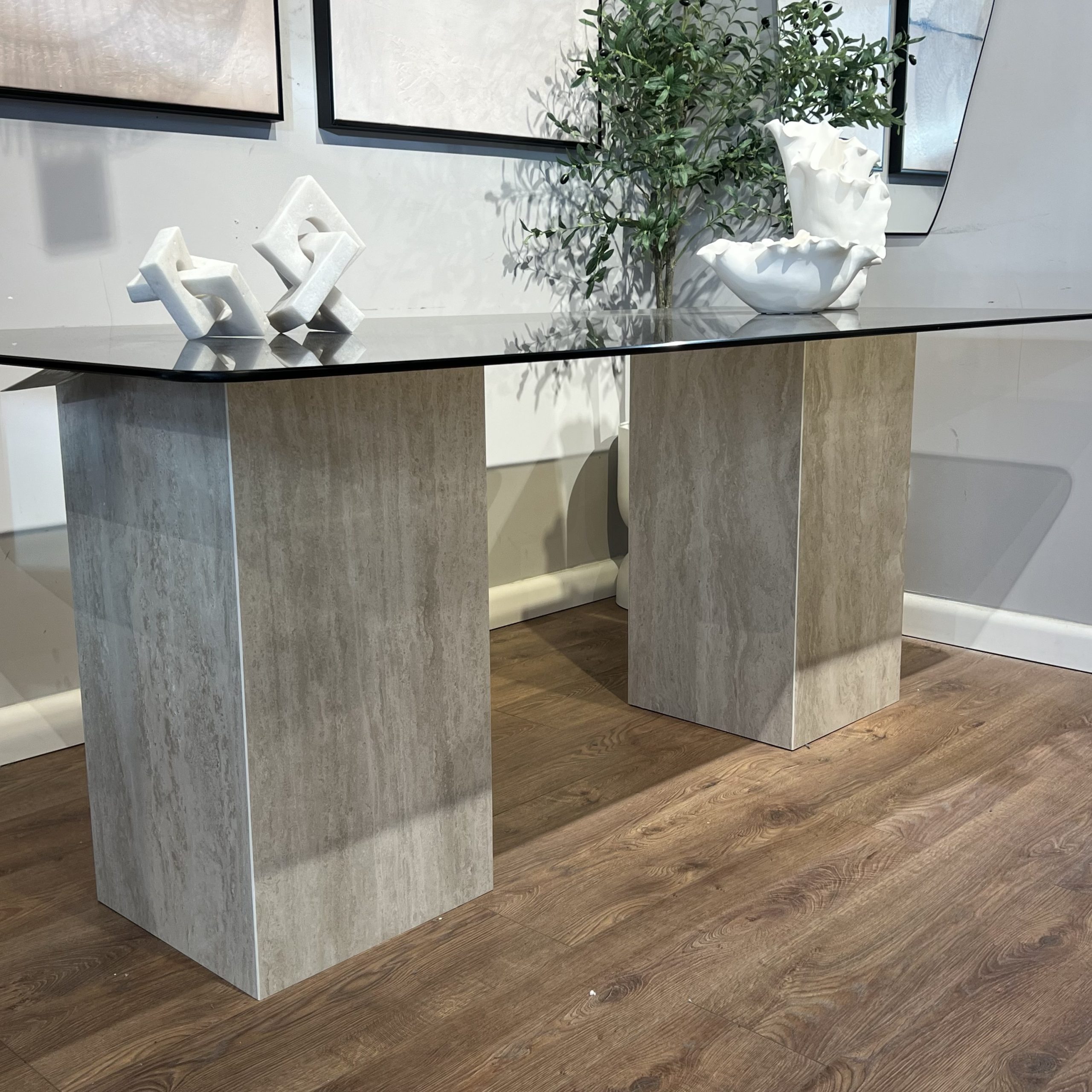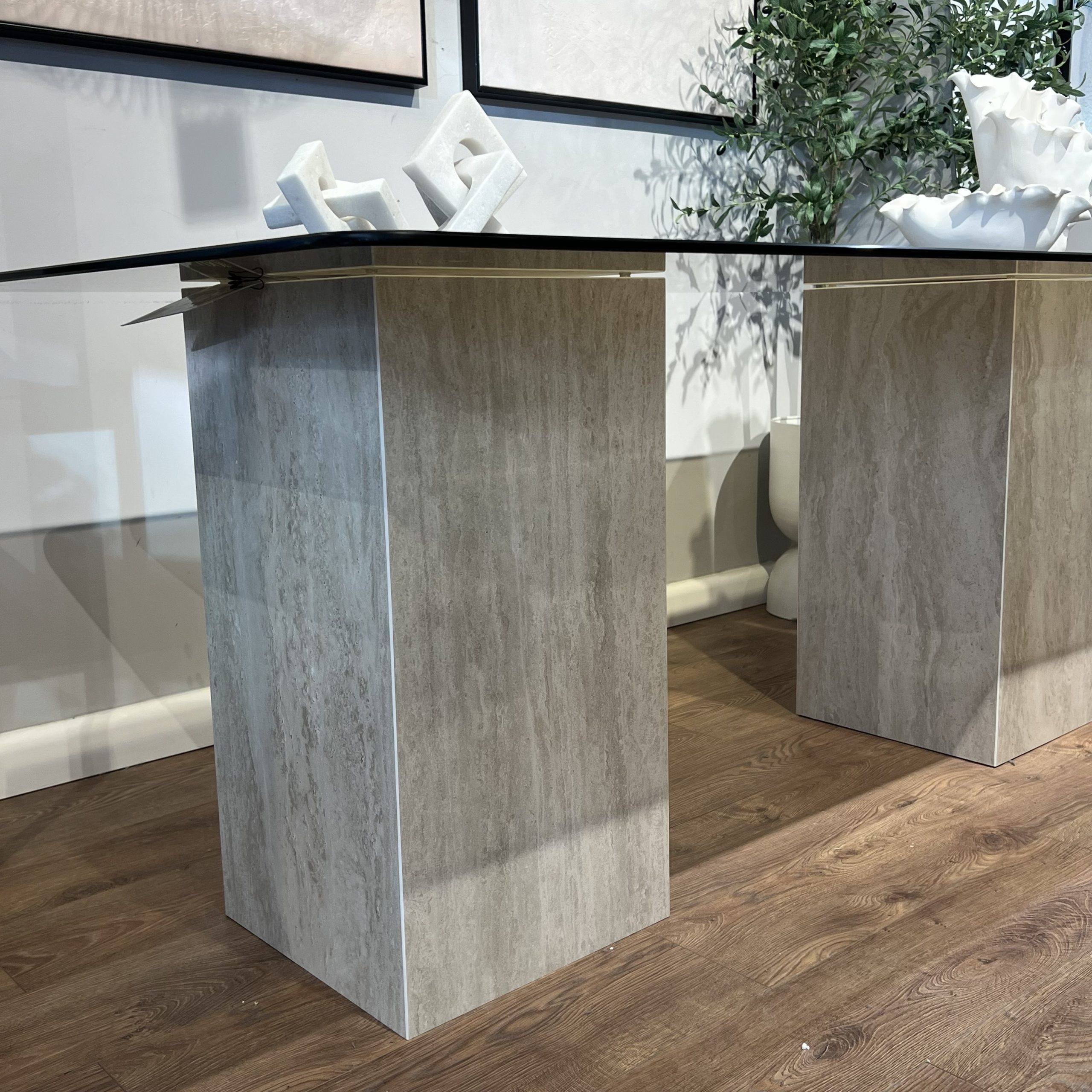 לפינת אוכל רגלי שיש מרובעות יוקרתיות וזכוכית מחוסמת.