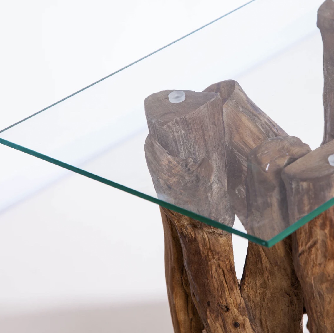 קונסולה דגם גלילה משורשי עץ עם פלטה זכוכית.