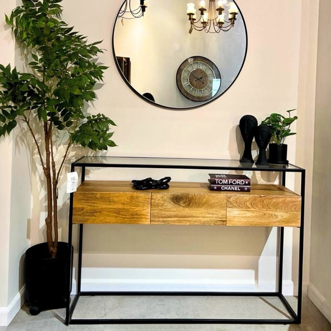 קונסולה מעוצבת עץ וזכוכית בשילוב ברזל שחור בעיצוב נקי דגם סוניל