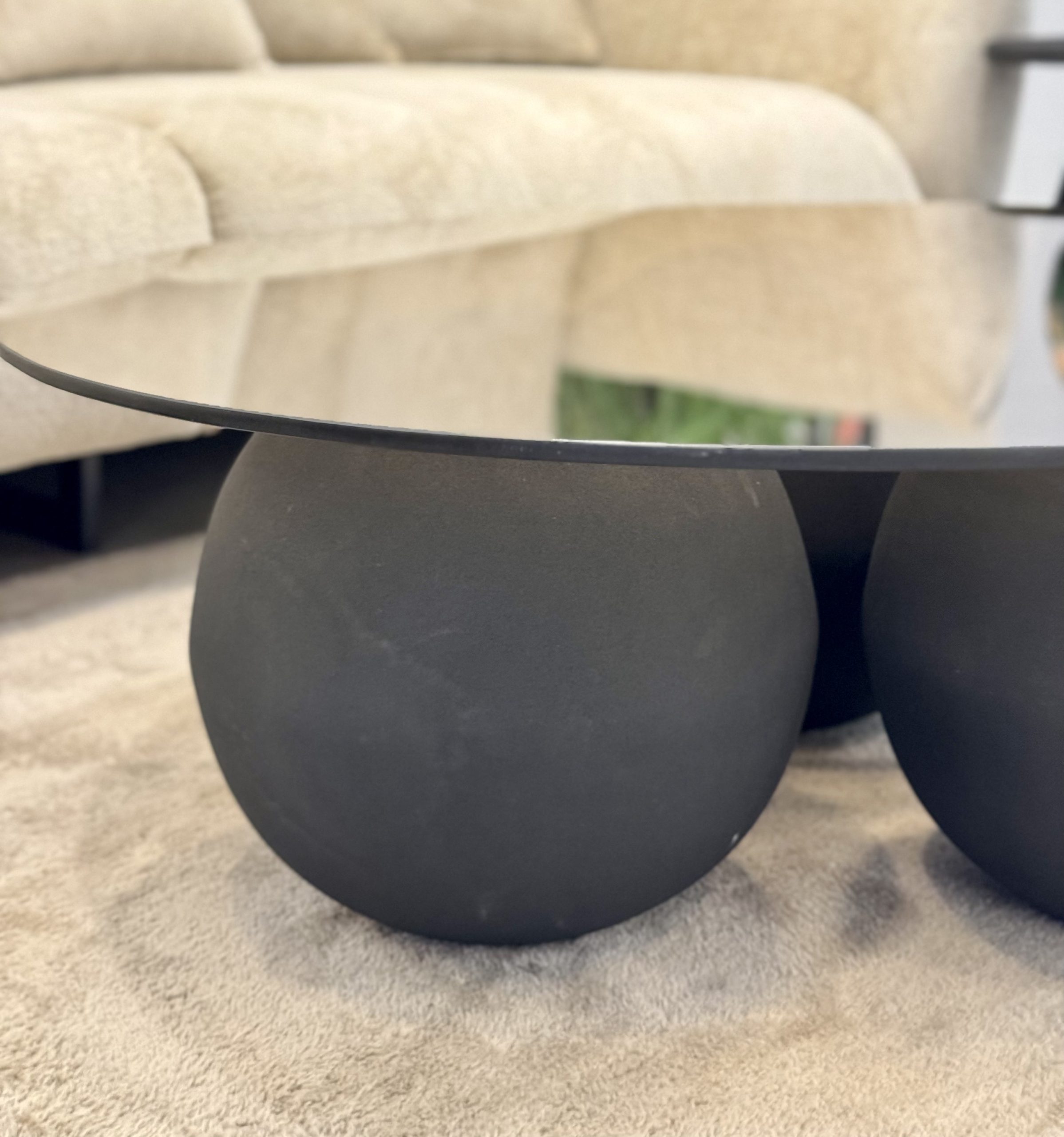 שולחן סלון עגול דולור זכוכית כהה בסיס כדורים שחור דגם ראבי