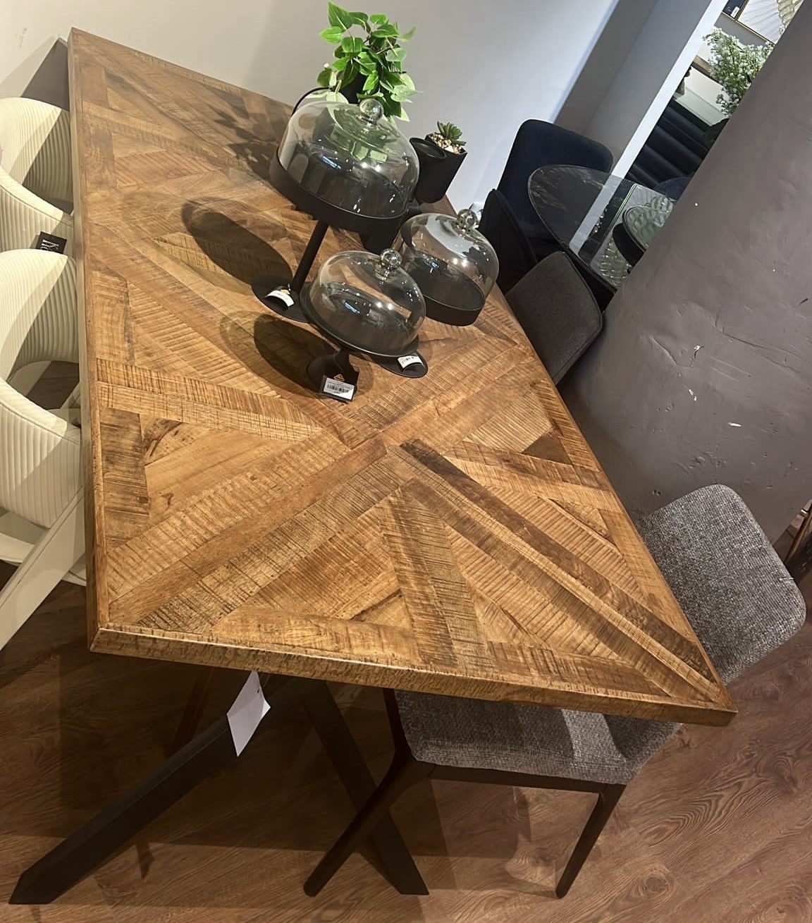שולחן פינת אוכל מרשים דגם דאלי מלבני העשוי מעץ מלא בעיצוב כפרי וחמים, רגל השולחן מברזל שחור חזק ויציב.