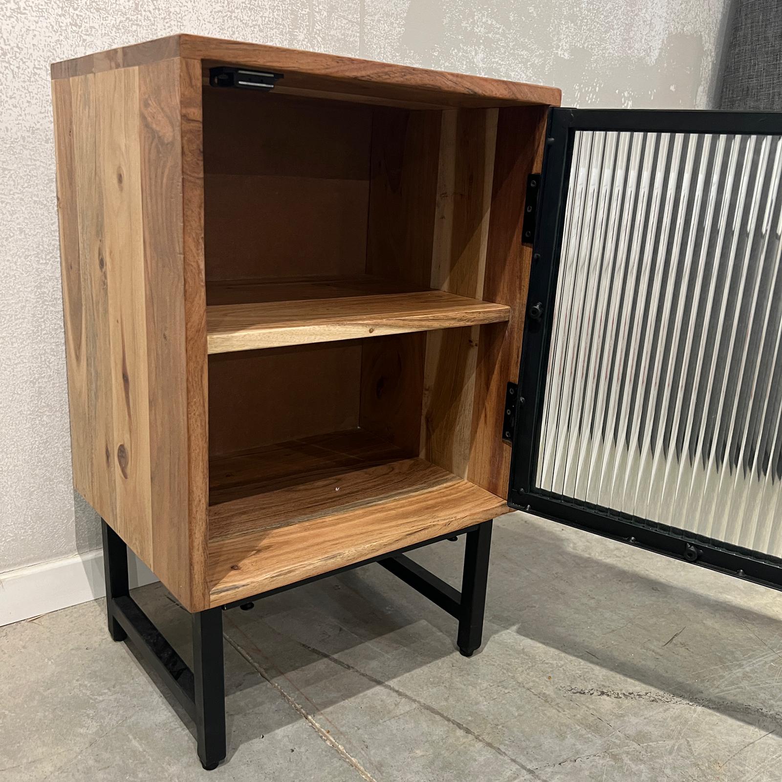 שידת צד עשויה עץ שיטה, בעלת דלת זכוכית ומסגרת ברזל שחור.