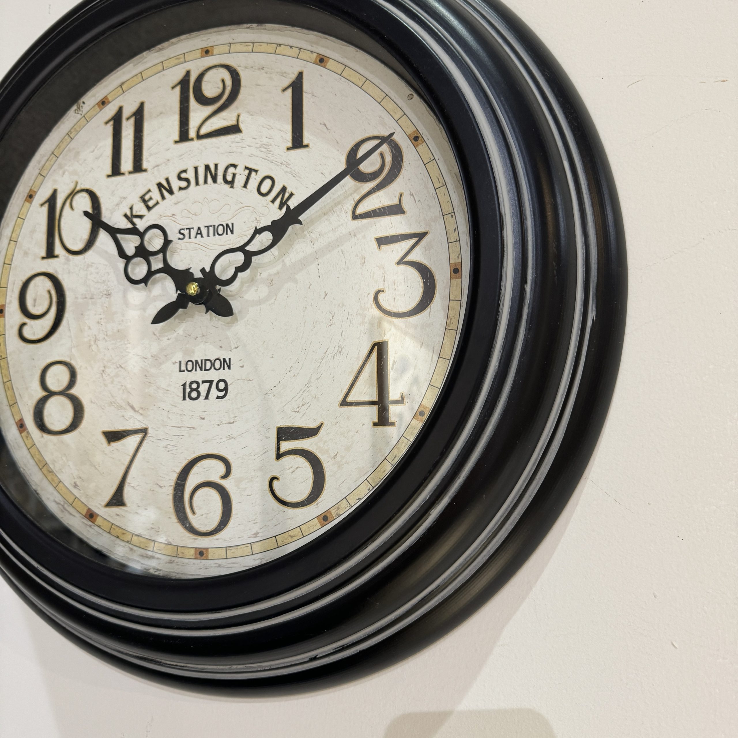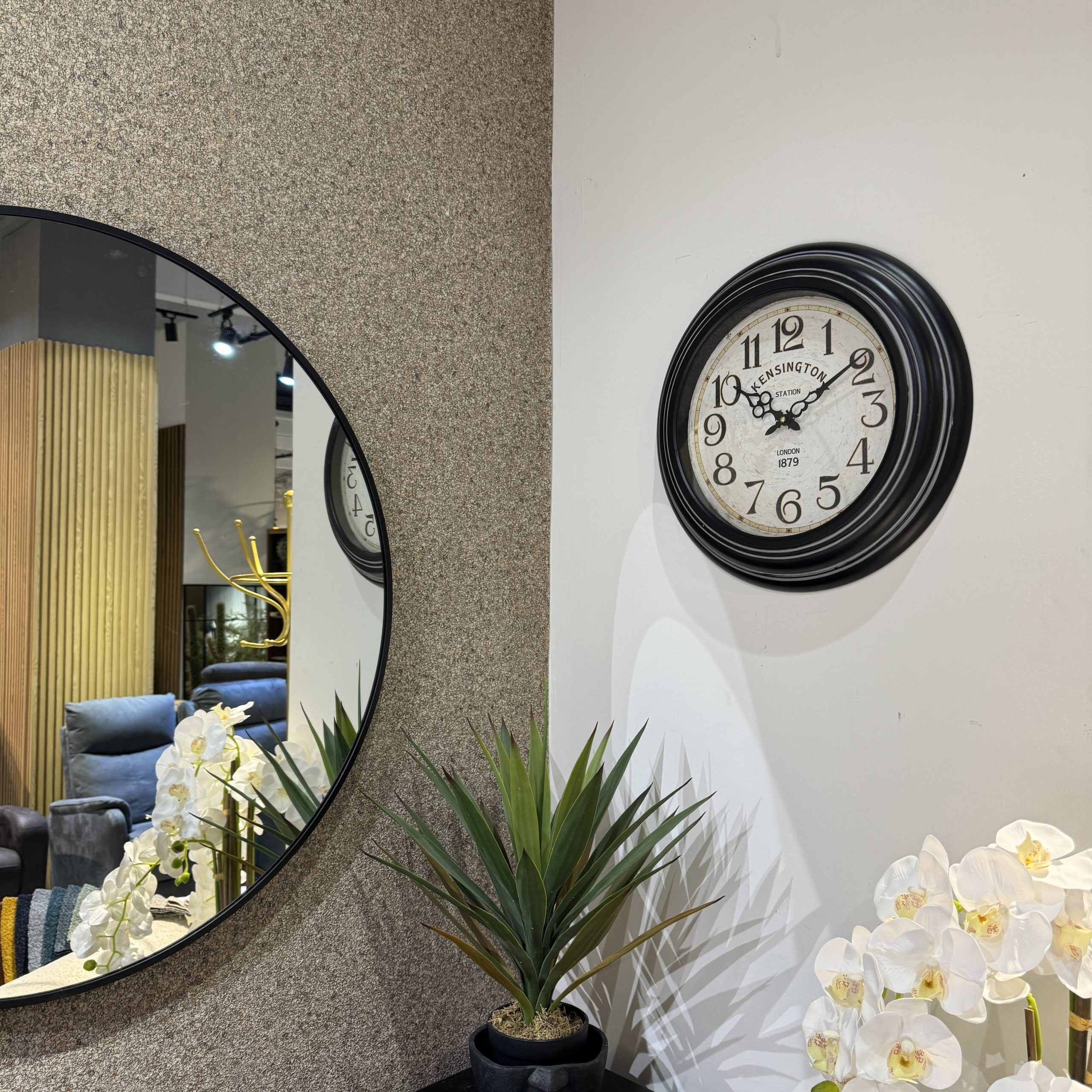 שעון קיר מרשים בעל מסגרת שחורה בשילוב רקע שחור או לבן וזכוכית למראה יוקרתי.