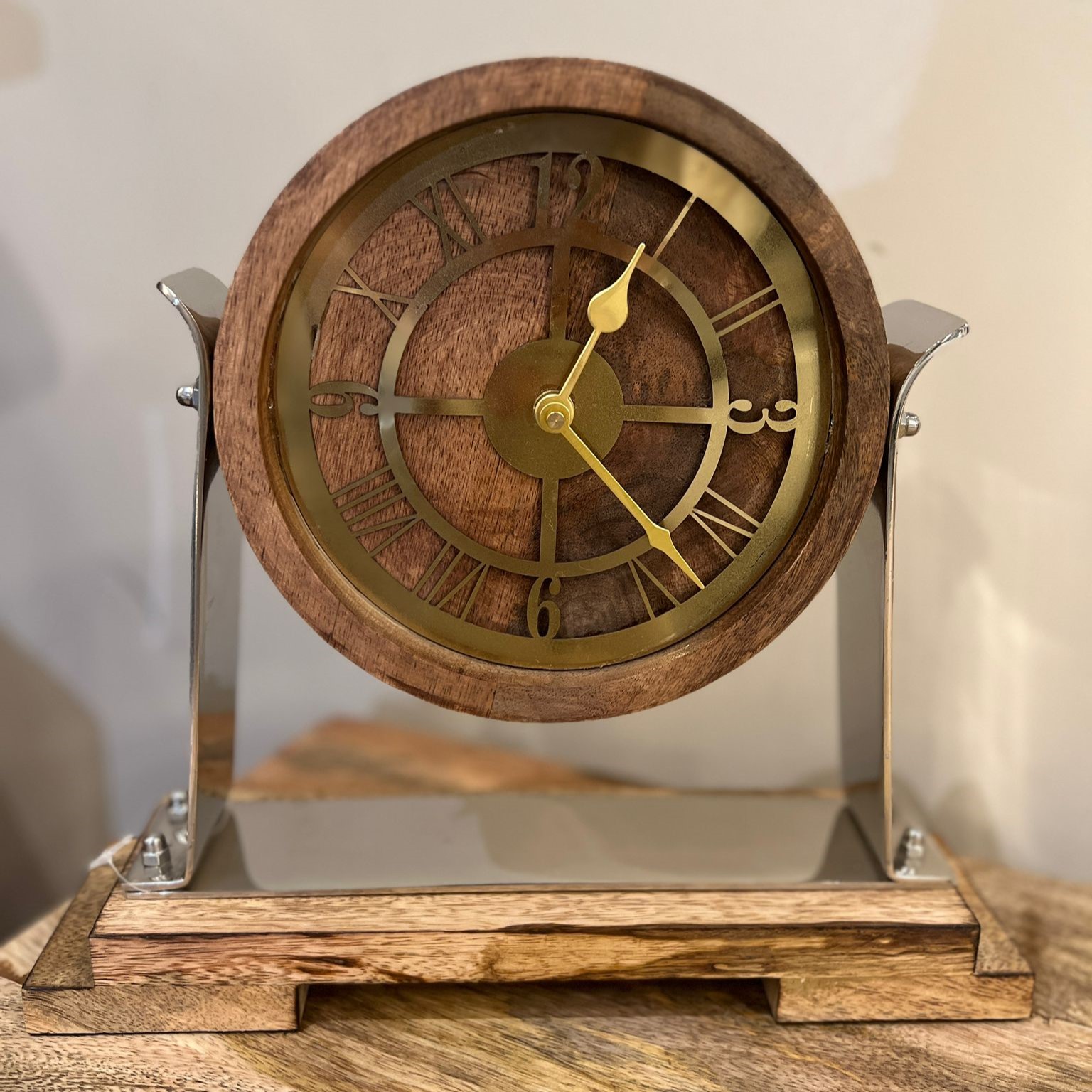 שעון שולחני דקורטיבי דגם שאניב. עשוי עץ טבעי, מסגרת זהב ומעמד כסף ועץ. מידות: 29/8/27 ס"מ.